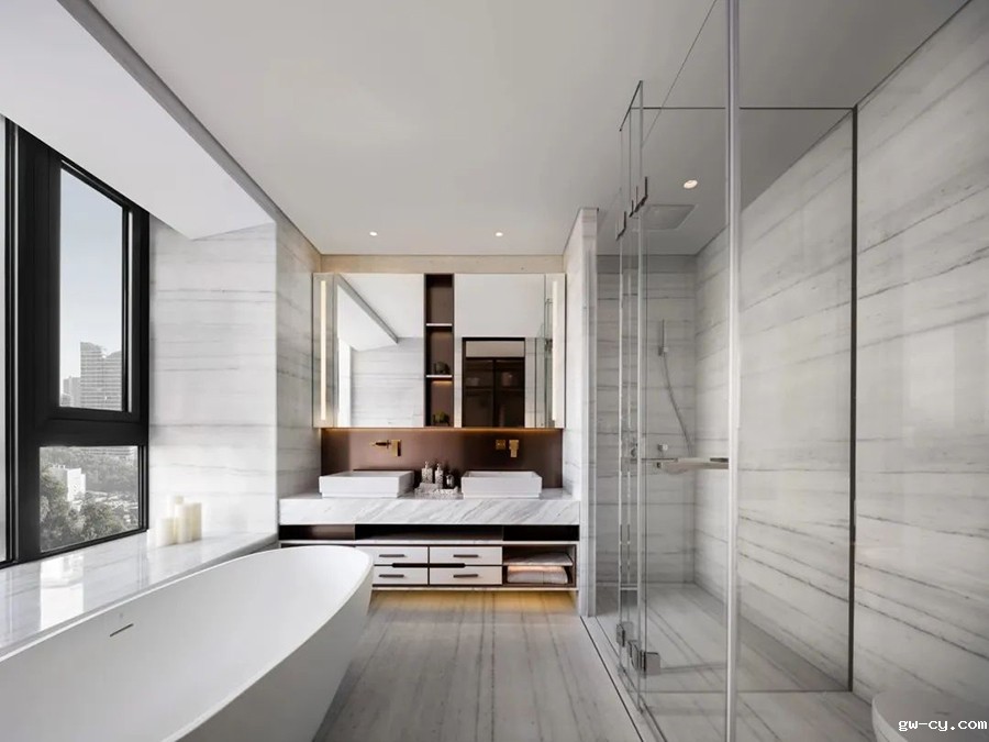 卫生间的墙面和地面铺满大理石,山水泼墨般的肌理为空间增添了别样意境,浴缸临窗而设,香薰的香气自然弥漫在整个空间。