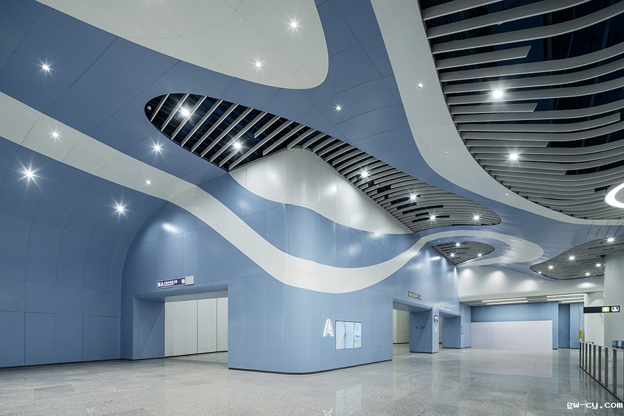 车站两侧天花结合海洋生物造型元素与色彩,结合镂空剪影设计,灯光投射在墙面上,创造出如同阳光洒落海面的虚实光影效果。