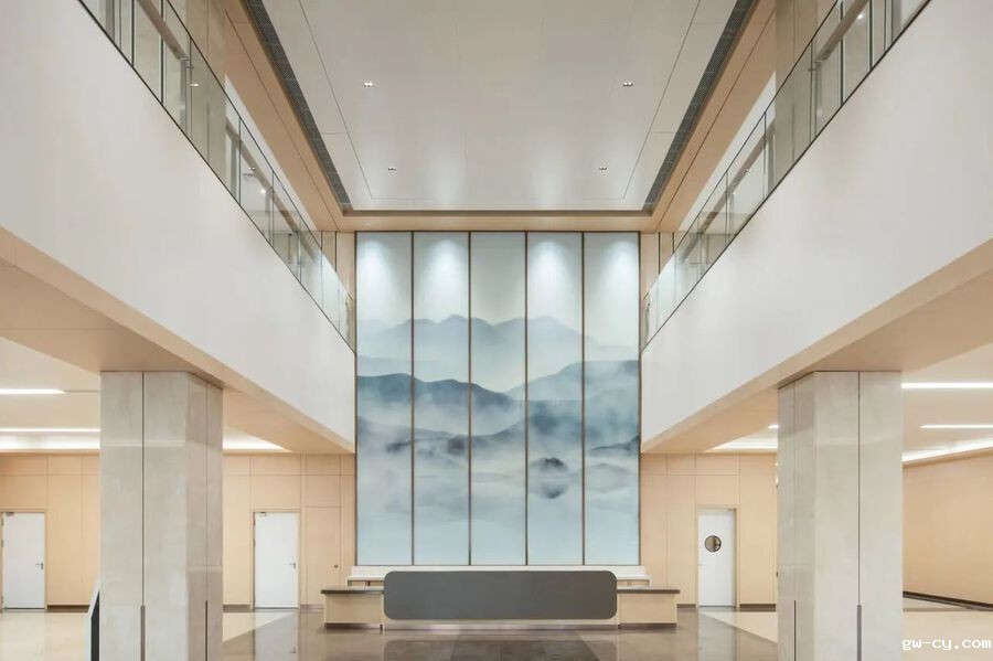 主大堂两侧借鉴中国传统画九重山的形态,连绵起伏的山脉展现出沉稳宽厚的气质,宛如中医所追求的人体脉象的平和与稳健。