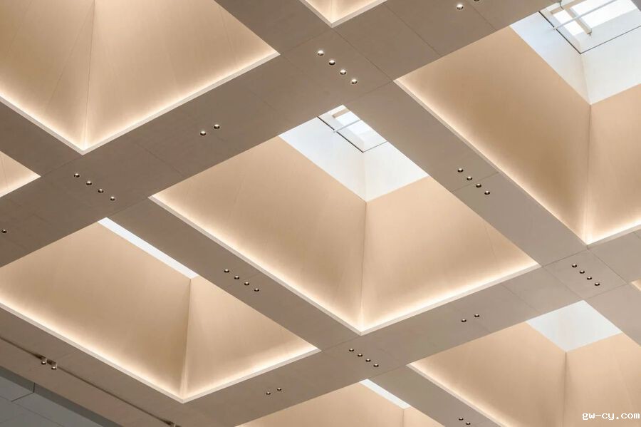 天窗的形状取材自中医“药柜”,其整体采纳了九宫格的设计方案。阳光透过这的天窗铺满大厅,整齐规整里,含蓄地透露着典雅的格调。