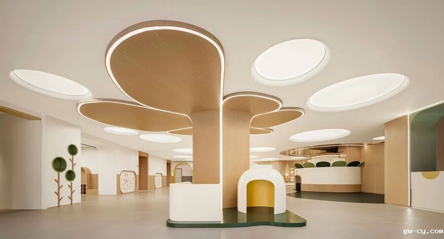 移步左侧的多功能活动室,空间处处都运用了圆弧元素,不同的角落里设置了游乐、阅读等功能区域,增加场所趣味性的同时,保证了内部空间的宁静。