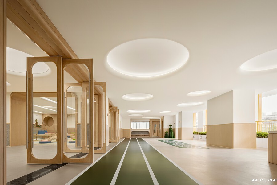 J&A在立面提升及室内设计中引入“天圆地方”的设计理念,通过灵活的空间布局,搭配中国传统色彩元素与贴心设施,为孩子们提供了一个温馨、安全且富有启发性的成长空间。