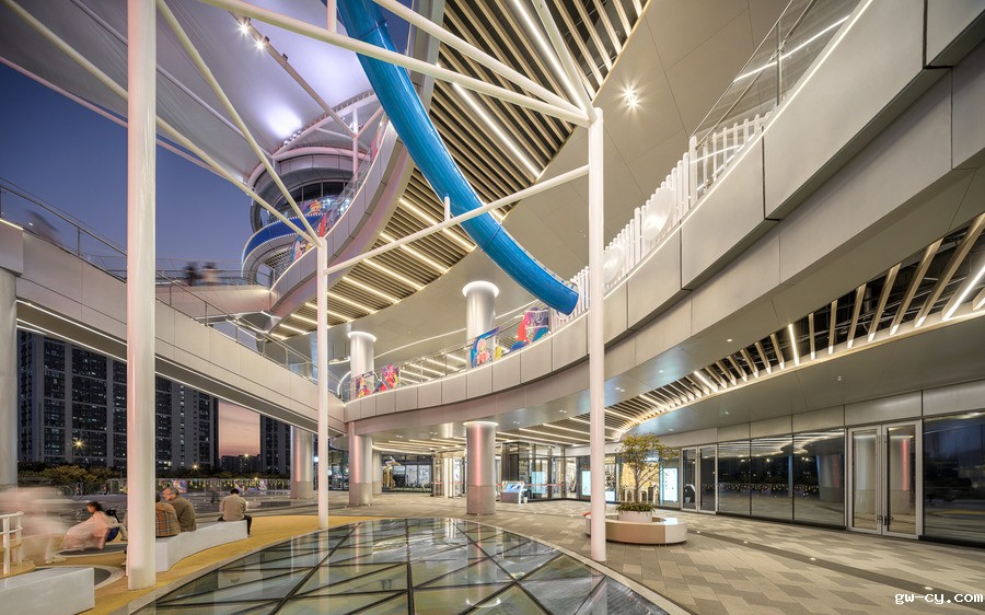 主副商业楼围绕中心广场形成围合式建筑形态,运用“水中莲花”的设计手法串联三个地块,让中央下沉广场成为地下空间亮点,并形成24小时夜经济特色街区。