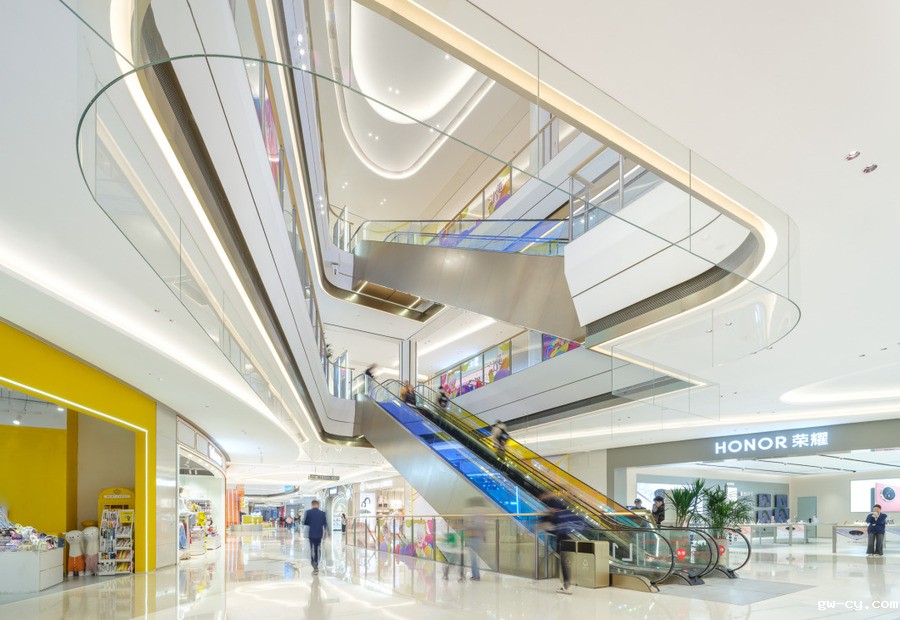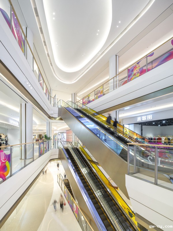 扶梯内嵌于店铺之间,通过包裹式的设计优化周边实墙的视觉感受,同时显著提升了扶梯入口的昭示性。
