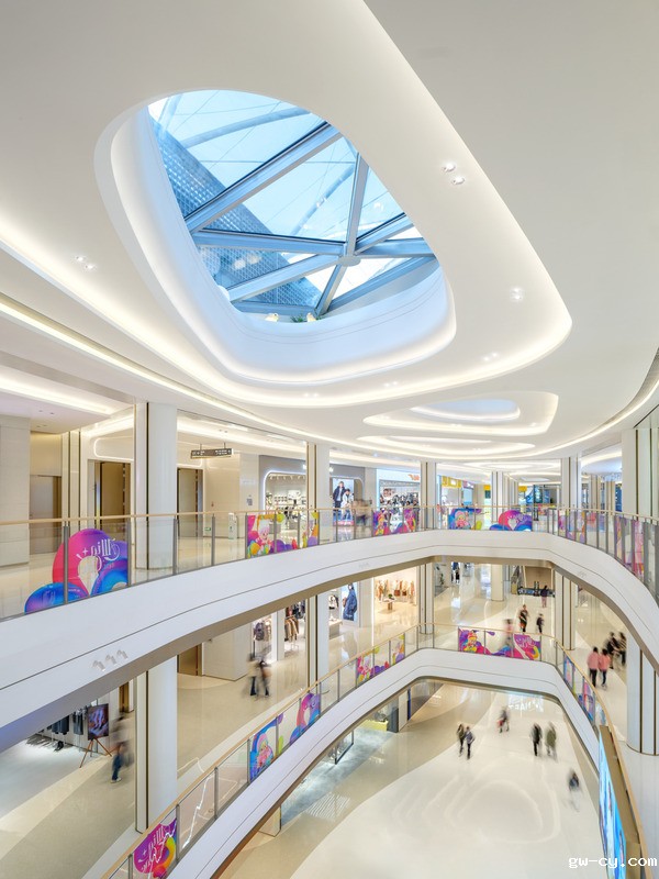主中庭以“流水”的形态勾勒空间轮廓,顶部结合雨花石造型天窗,通过简洁精致的设计手法,贯彻“轻硬装重氛围”的理念,塑造极具记忆点的空间特色。